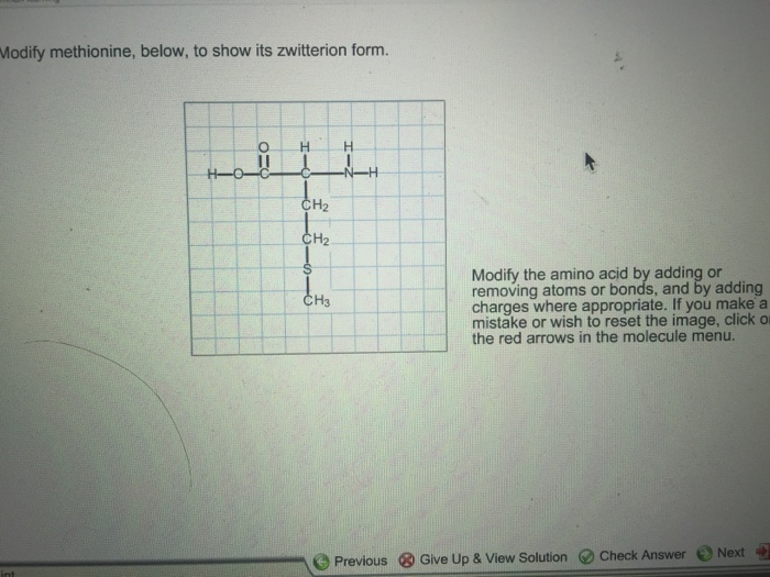 modify methionine to show its zwitterion form select draw more n 0 s h